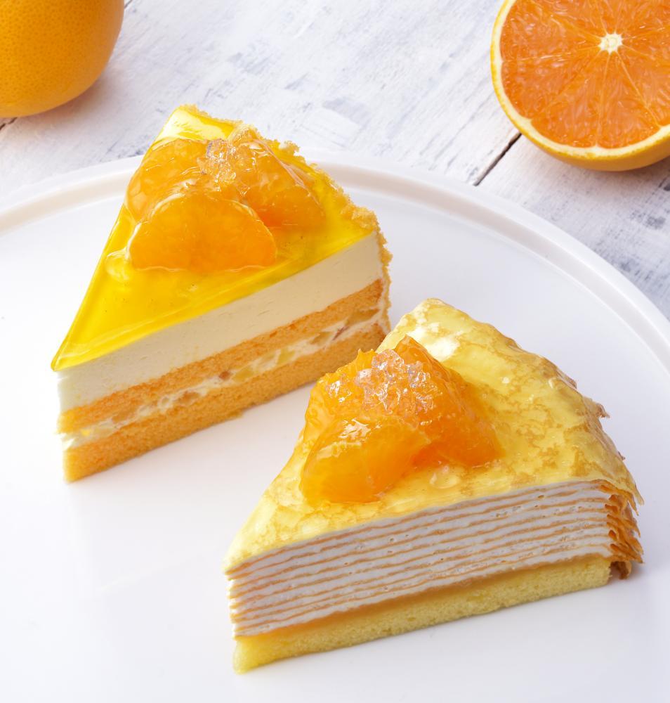 「愛媛産 清見オレンジ」を飾ったミルクレープです。クリーミーでなめらかな味わいの「キリ クリームチーズ」を使用したクリームと、オレンジ風味のクレープを重ね、清見オレンジとクラッシュゼリーで爽やかに仕上げました。価格は480円。