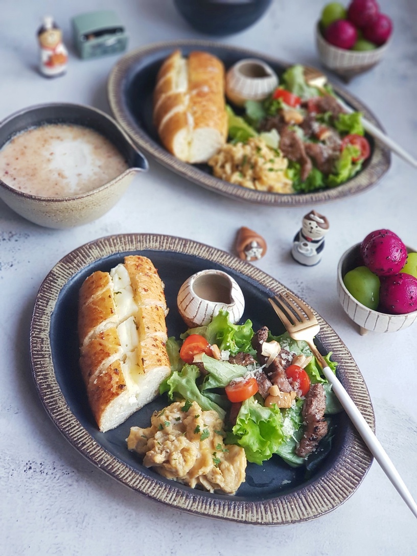 廚藝精湛的網友將蒜香奶油乳酪麵包切成片狀,加上豐富的生菜、水果球、日式芝麻醬、綜合堅果、牛小排燒肉片後擺盤,與外面NT300的早午餐簡直一樣,看了讓人好想也來上一盤~