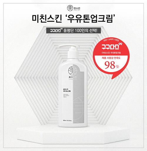 인플루언서 마케팅 구구다스를 통해 진행된 이번 설문은 소비자 100인을 대상으로 진행됐고 약 5일간 제품을 실제 사용해보며 직접 경험한 피부 변화에 대해 설문조사를 실시했다. 설문 결과 전체 참여자의 98%가 미친스킨의 ‘우유톤업크림’에 만족한다고 답했다.