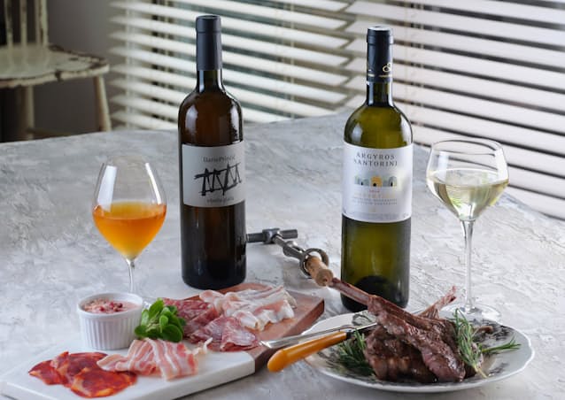 タラは、「サントリーニ島の多くの白ワインのように、風味豊かでしっかりとした酸味や塩味があれば、肉との相性は抜群」と解説する。